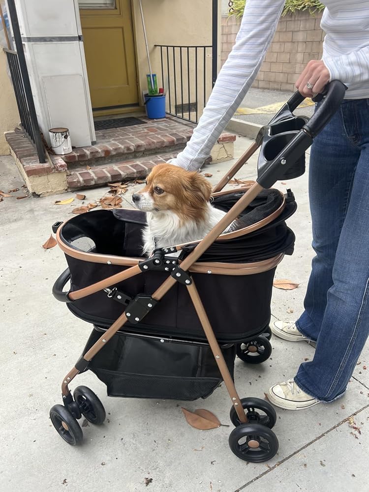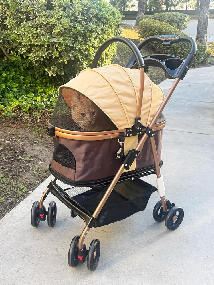 I got this stroller for my cat and for my 14 year old dog who can no longer take long walks! I love that I can take my cat out of the house because at our old house he was able to go outside but at my new place he doesn’t have outside access. This gives him the ability to get some outside air and sun which I love for him. My senior dog has bag leg shakes so I wanted to get hm something so he can still have quality of life. Love this stroller.Easy set upCup holder for water and coffee is a nice touchLove the brown and tan color (color of my pets)😊Most of all love that it’s not too bulky! Easy to maneuver and take on a long stroll.Recommend to those who love that outdoors and for pets who love the same. Sunset walks are really easy now for my senior pet.